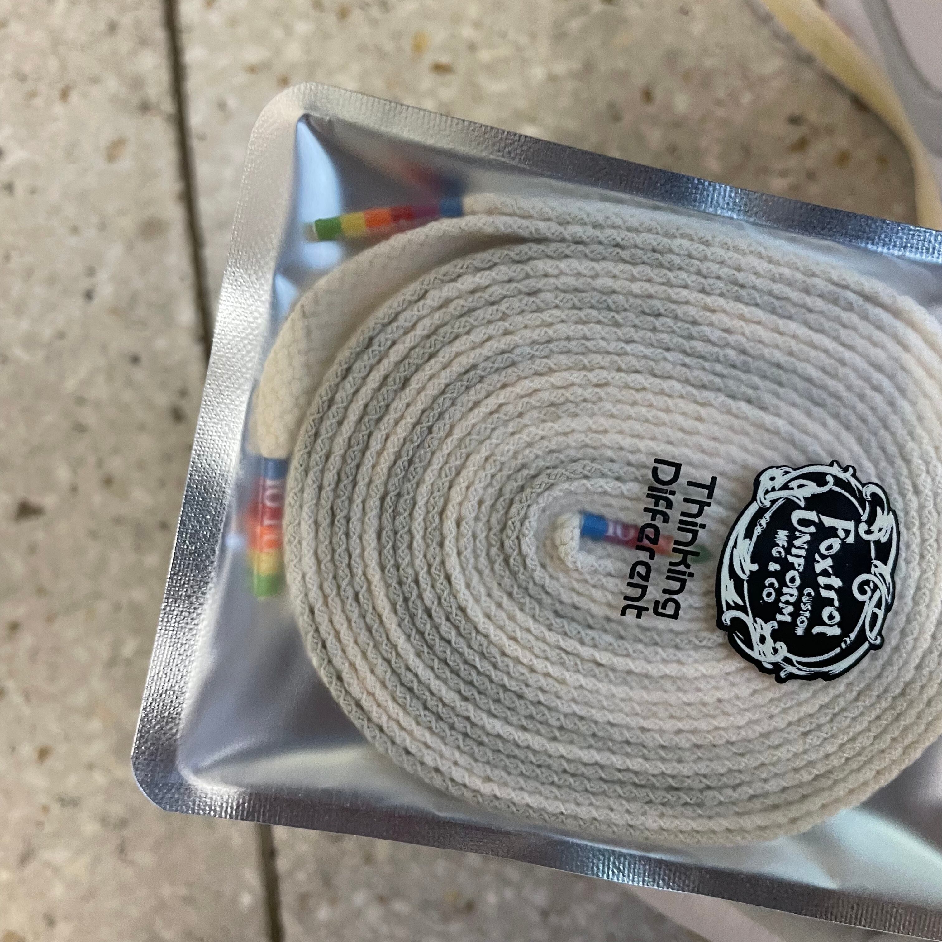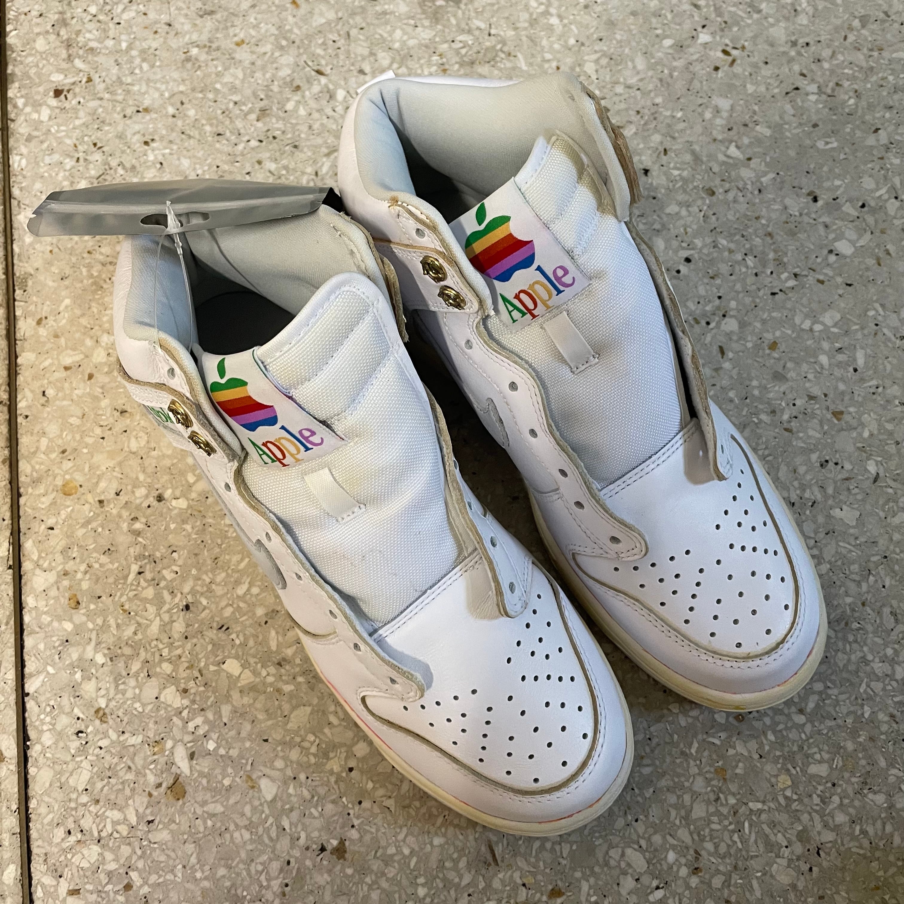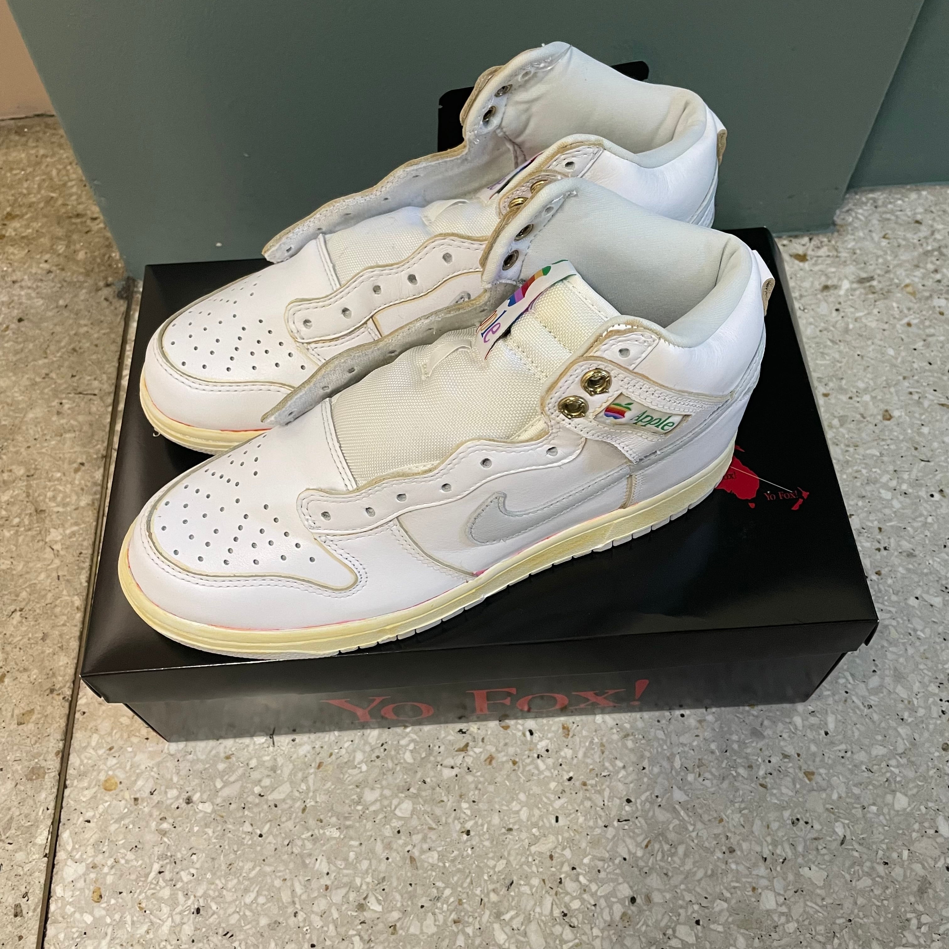 Fictional Employee Dunk Highと名付けられた本モデル。1990年代に「Apple」が社員用に制作したスニーカーがテーマということで、全体に黄ばみなどのビンテージ加工が施され、シュータンとアンクル横には1977年から1998年まで使用されていた懐かしのレインボーロゴを配置。あわせて“Thinking Different”のテキストがプリントされたアグレットもレインボー仕様としたほか、レトロ感を増すためにアイレットの一部にゴールドのハトメを付属し、シューレースにはグレーのバーブワイヤーをあしらったりと、Apple信者およびスニーカーコレクターの心をくすぐるディテールが詰め込まれている。
