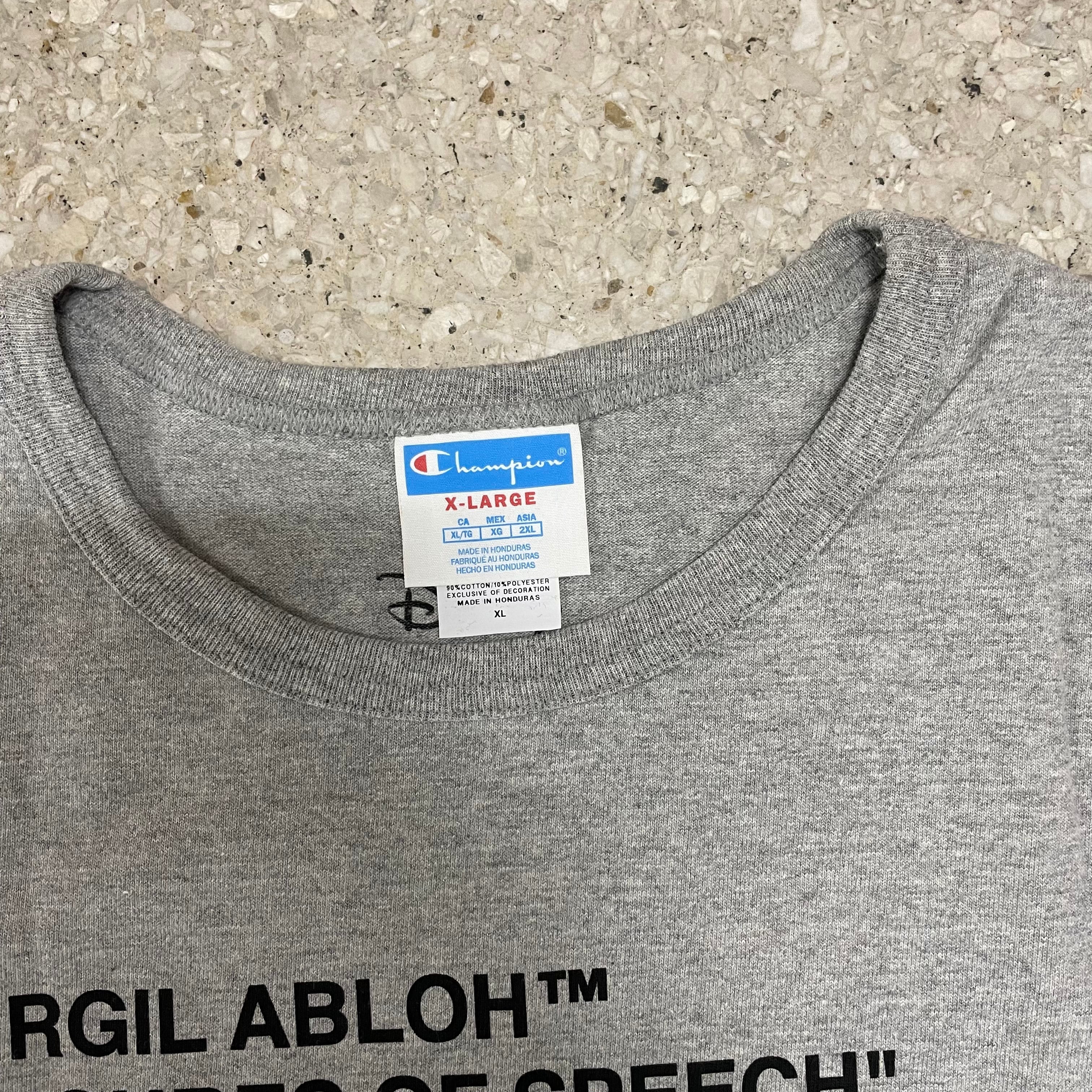 ヴァージル・アブローの「Figures of Speech」展の詳細が描かれたグレーのチャンピオンTシャツ。VAA、FOS、ディズニーの詳細を含むミッキーマウスのグラフィックを裏付けています。